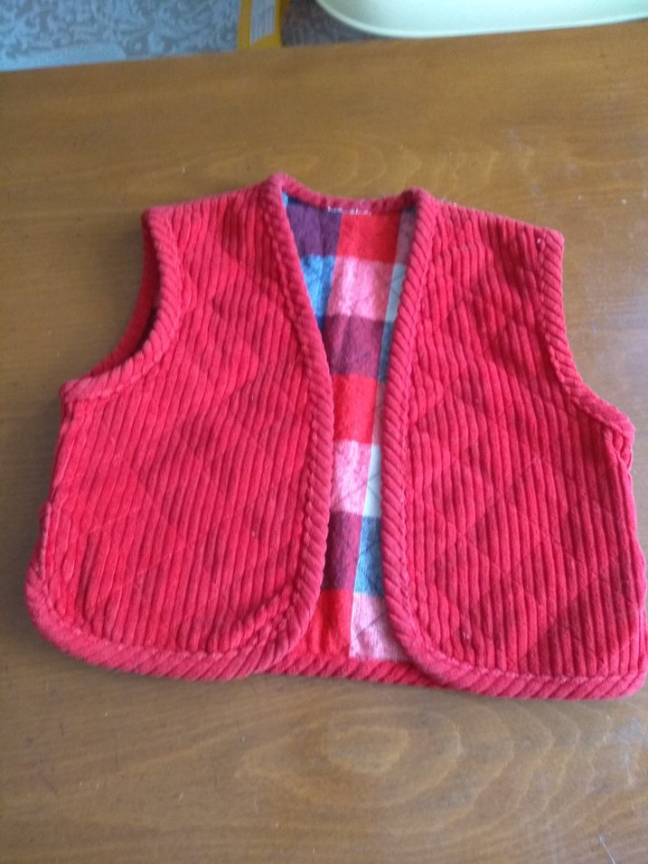 Renkli kırmızı örgü dokulu, yumuşak ve sıcak kumaştan yapılmış, kolsuz ve yuvarlak yakalı, bohem ve retro tarzda kız çocuk yeleği.