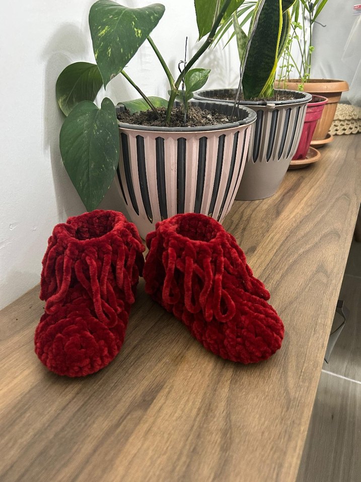 Kız çocukları için renkli kırmızı örme ev botu bohem tarzda ve kadife, yumuşak örme kumaştan üretilmiştir. 19/20/21 ayak numarası aralığındadır.