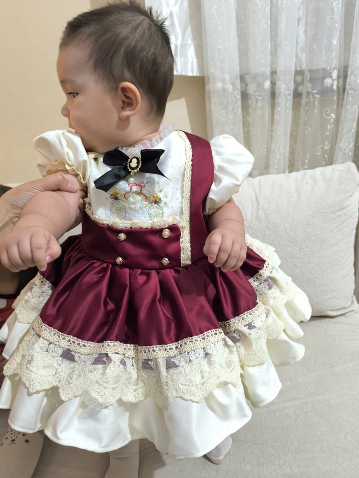 Pamuklu, dantel detaylı, uzun kollu ve halter yakalı, oturan kesim kız çocuk elbisesi. Koyu kırmızı renk ve baskılı desen içerir.
