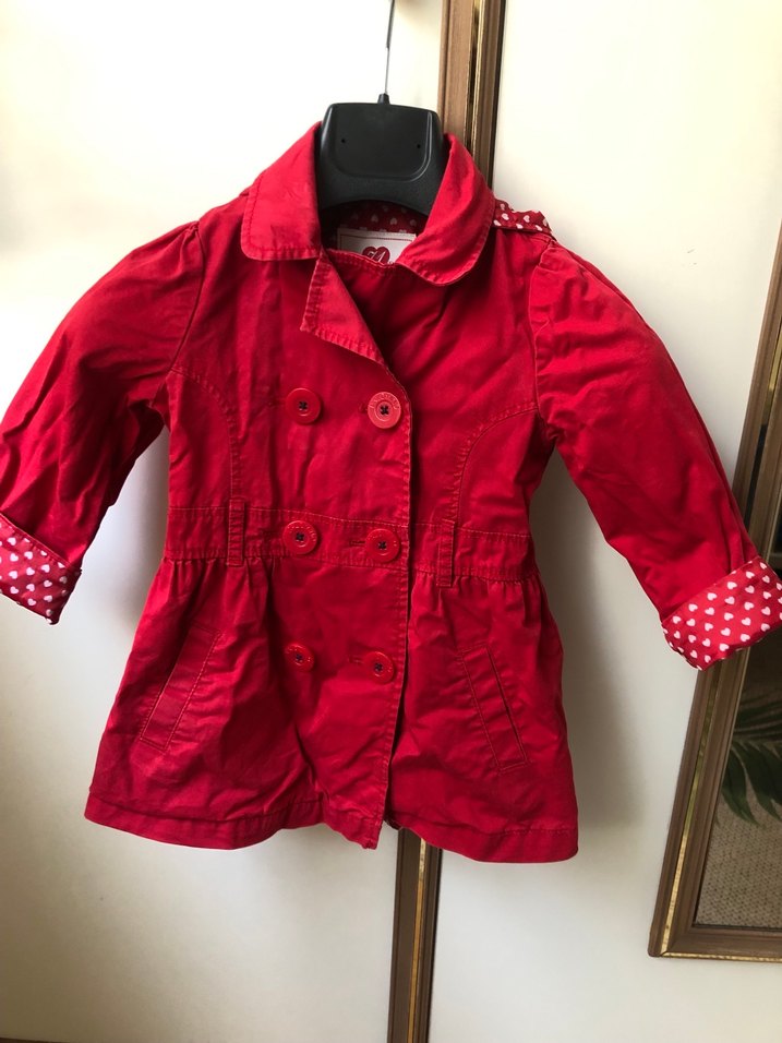 Kız çocuklar için kırmızı pamuklu, düğmeli ve yakalı, parlak kumaşlı, puantiyeli iç manşet detaylı, dar kesim ceket. Sokak tarzına uygun. 2-3 yaş için uygundur
