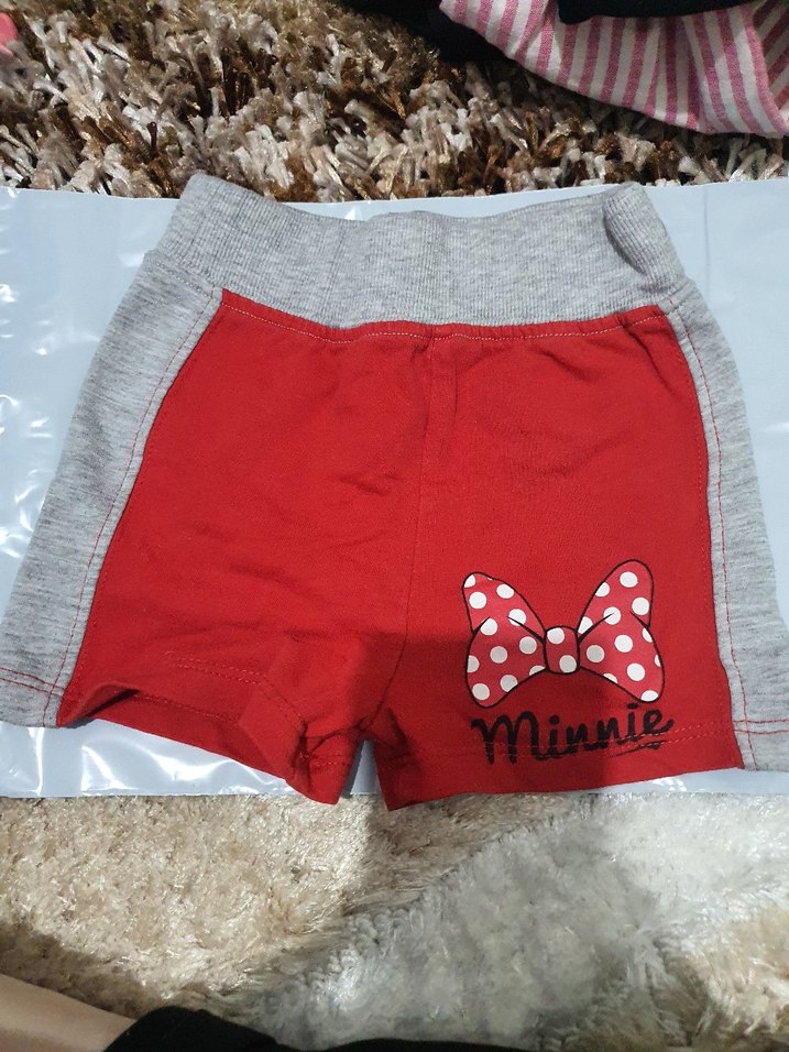 Kız çocuklar için pamuklu kırmızı şort, renkli Minnie baskısı ve fiyonk detayıyla. Rahat ve günlük kullanıma uygun. 1 yaş teklife açık