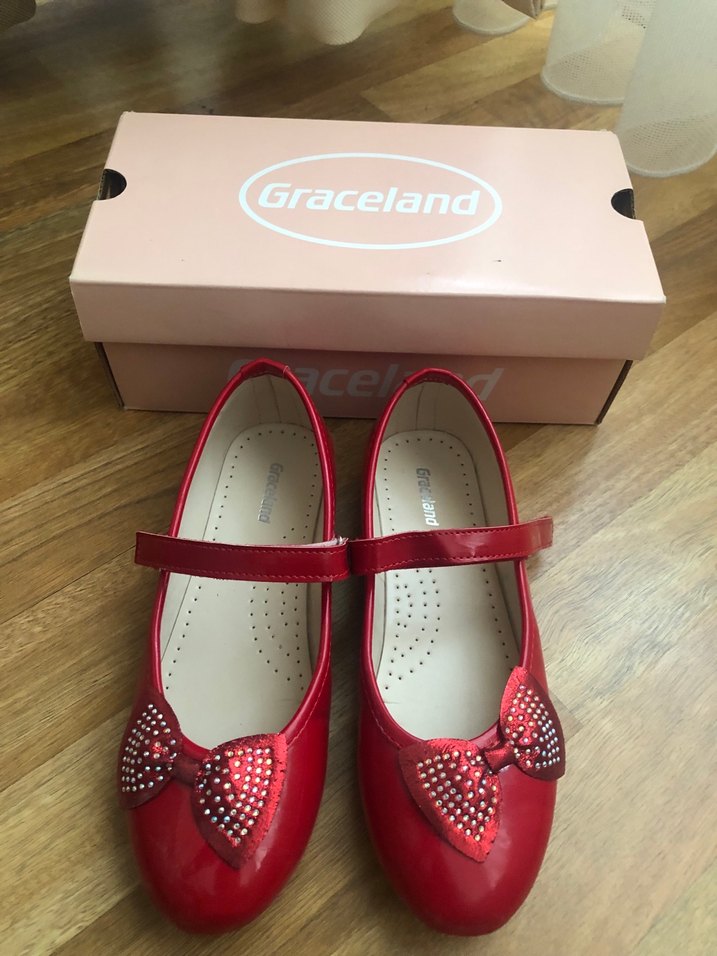 Yalnızca 1 kez kullanıldı.Kız çocukları için kırmızı parlak, tokalı bantlı ve baskılı fiyonk detaylı kauçuk babet . Graceland marka, trend sokak stili için uygun.