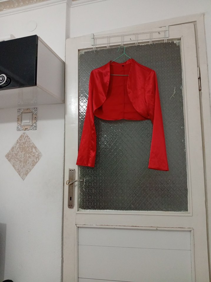 Kız çocukları için parlak kırmızı renkte, uzun kollu ve düğmeli, straplez yakalı bolero. Sokak stili için uygun şık bir parça.