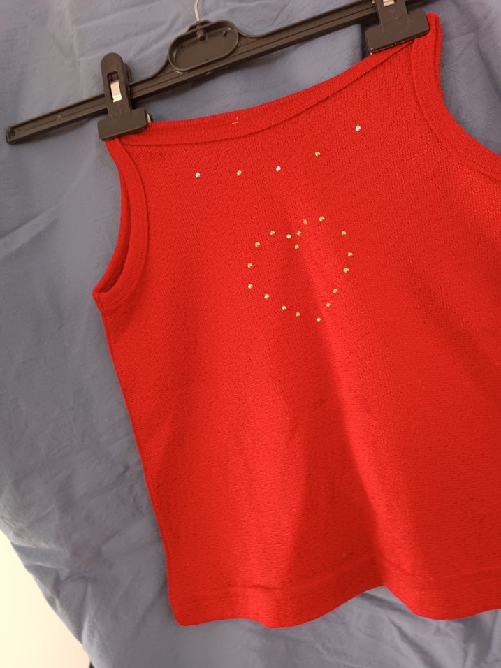Fitted kesim, yuvarlak yaka ve payet detaylı, parlak kırmızı sentetik kumaştan kız çocuk kolsuz atlet.