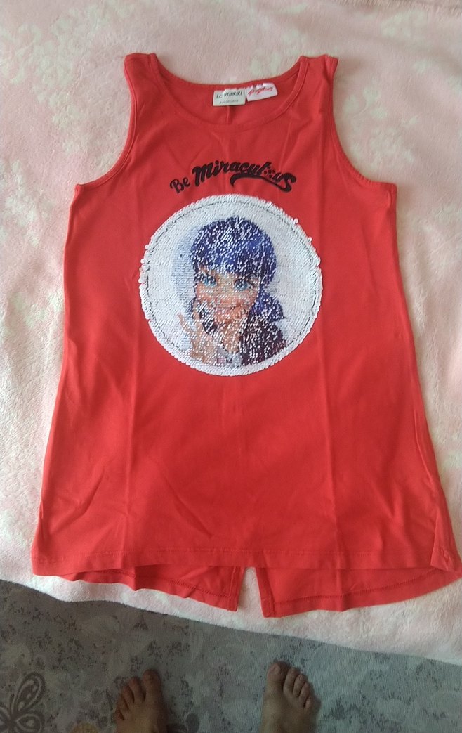 Kırmızı renkli, kolsuz ve dar kesim kız çocuk tişörtü. Önünde payetli baskı bulunur, sokak stili için uygundur. yeni gibi hiç bir özürü yok
