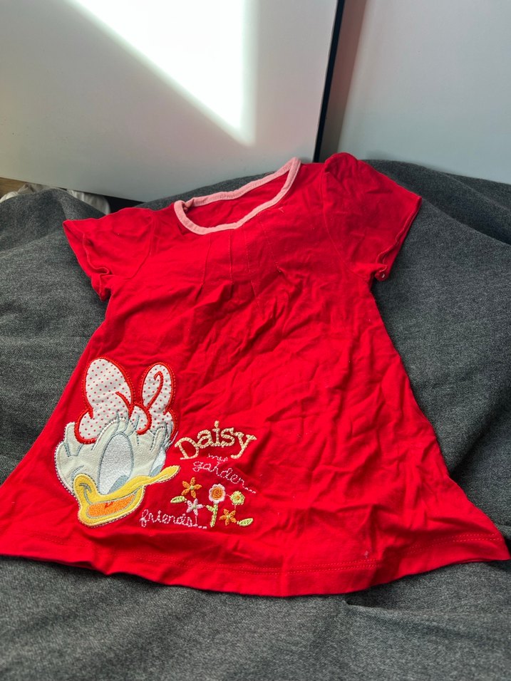Kırmızı renk, kısa kollu, bol kesim kız çocuk tişörtü. V yakalı, renkli baskılı ve payet detaylıdır. Trendy ve rahat bir tarz sunar.