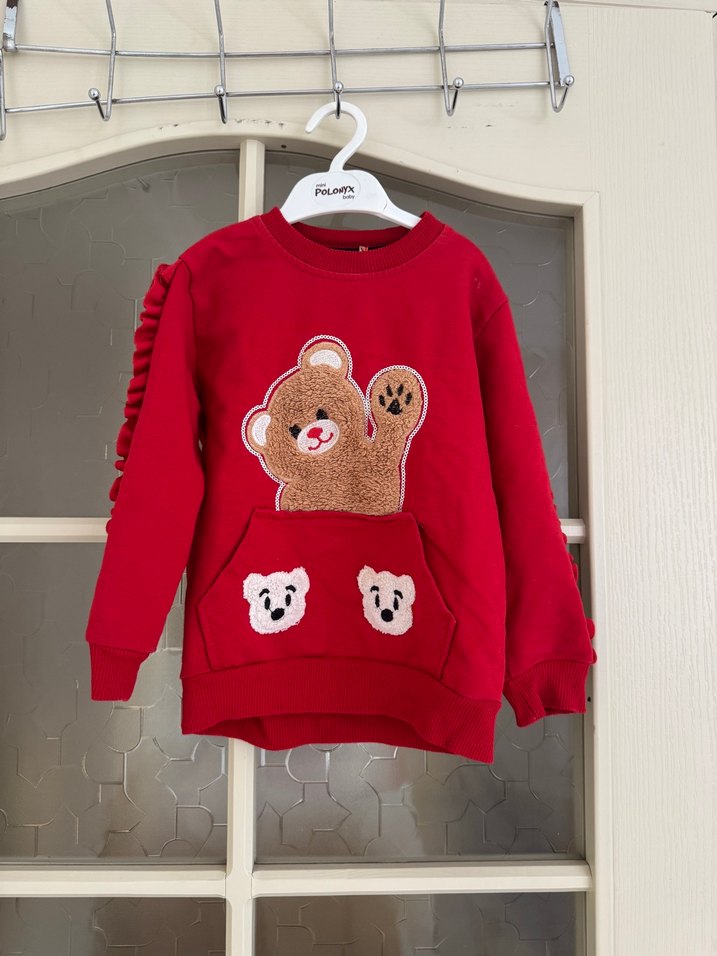Kız çocukları için uzun kollu, yuvarlak yakalı ve bol kesim sweatshirt. Yumuşak ve sıcak kumaştan üretilmiş, renkli baskılı ayı figürleri ve peluş detaylar içerir.