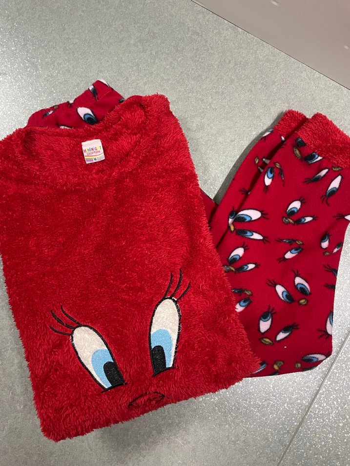 Kız çocuklar için yumuşak peluş, uzun kollu pijama takımı, renkli nakışlı göz detaylı üst ve canlı desenli pantolon ile rahatlık sağlar. 13-14-15-16 yaş grubuna uygundur