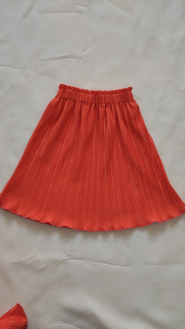 Kız çocukları için renkli kırmızı pileli, bol kesim etek, sentetik kumaştan üretilmiştir.