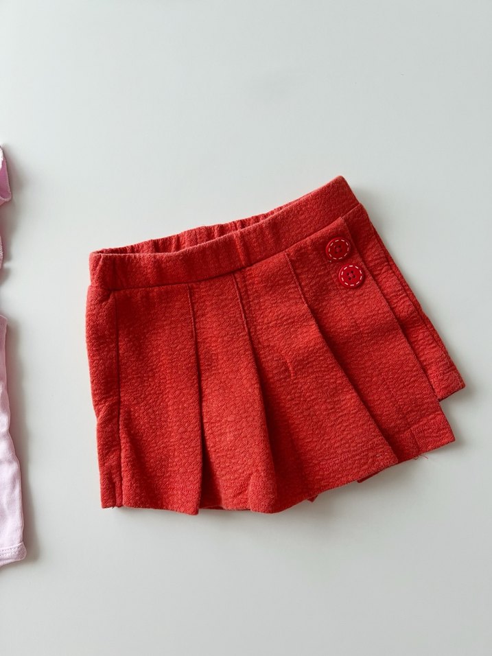 Kız çocukları için kırmızı, pilili ve dar kesim etek. Düğme detayları bulunan yumuşak ve sıcak kumaştan yapılmıştır Şort etek