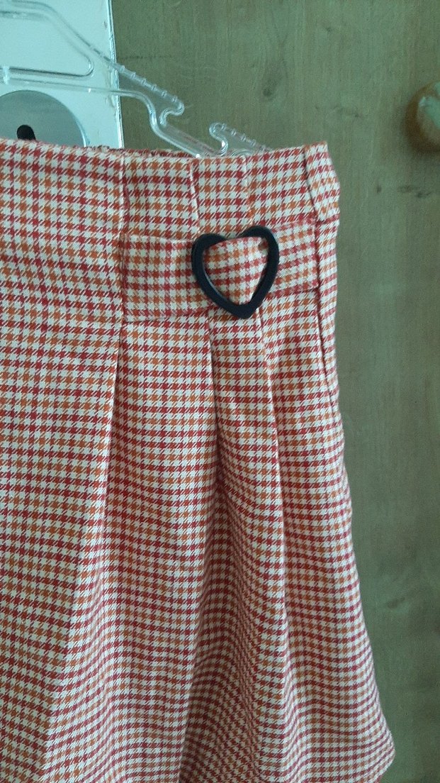 pamuklu kumaştan üretilmiş, pilili ve kırmızı ekose desenli, bol kesim kız çocuk eteği. Kalp şeklinde toka detayı bulunur.