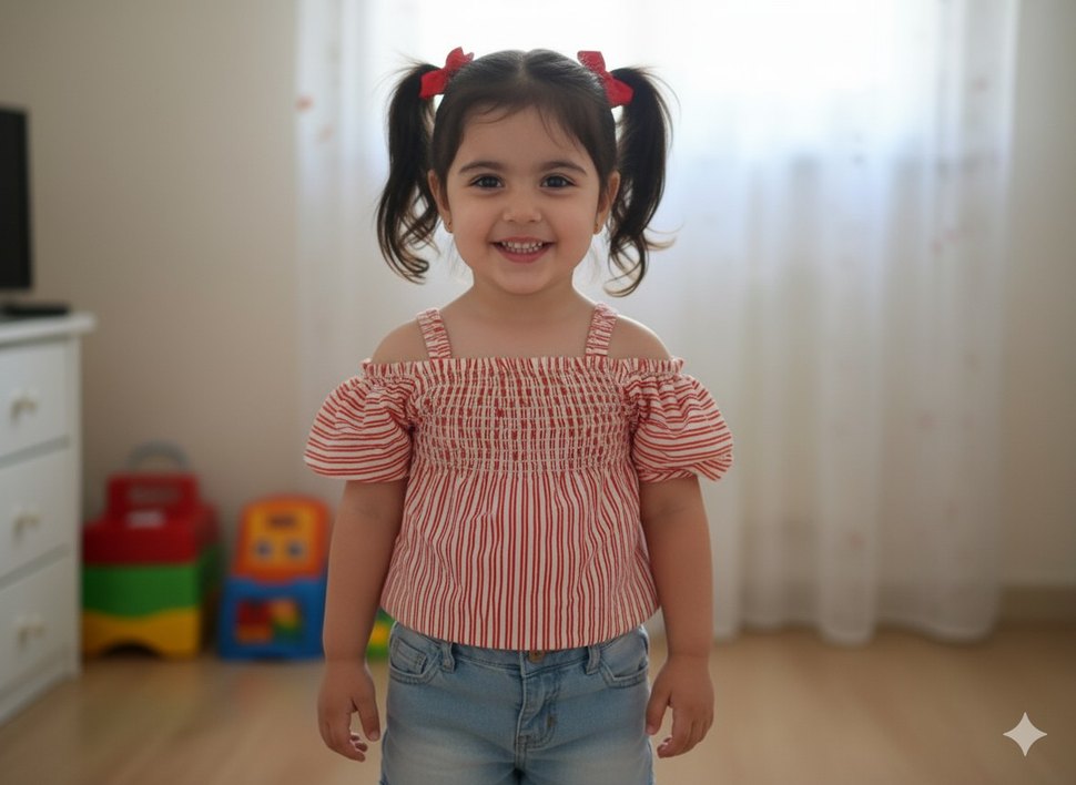 Pamuklu, piliseli, kırmızı renkli, kısa kollu, omuz detaylı kız çocuk bluz, rahat ve renkli tasarımıyla öne çıkar.