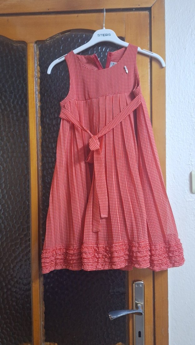 Kız çocuk için piliseli, halter yakalı ve askılı triko elbise. Bol kesimli, canlı kırmızı renkte, bohem tarzda bir modeldir.
