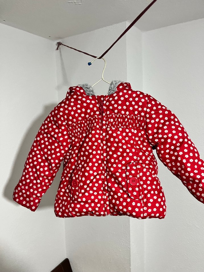 Kız çocukları için kırmızı, düğmeli, yakalı, renkli puantiyeli desenli, yumuşak ve sıcak kumaştan üretilmiş dar kesim mont.