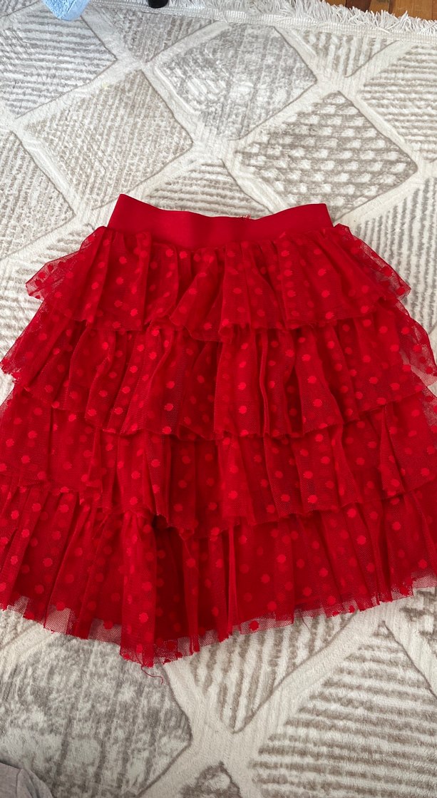 Kız çocukları için renkli puantiyeli, kat kat fırfırlı, sentetik kumaştan yapılmış kırmızı fitted etek. Bohem ve retro pop kültür tarzını yansıtır.