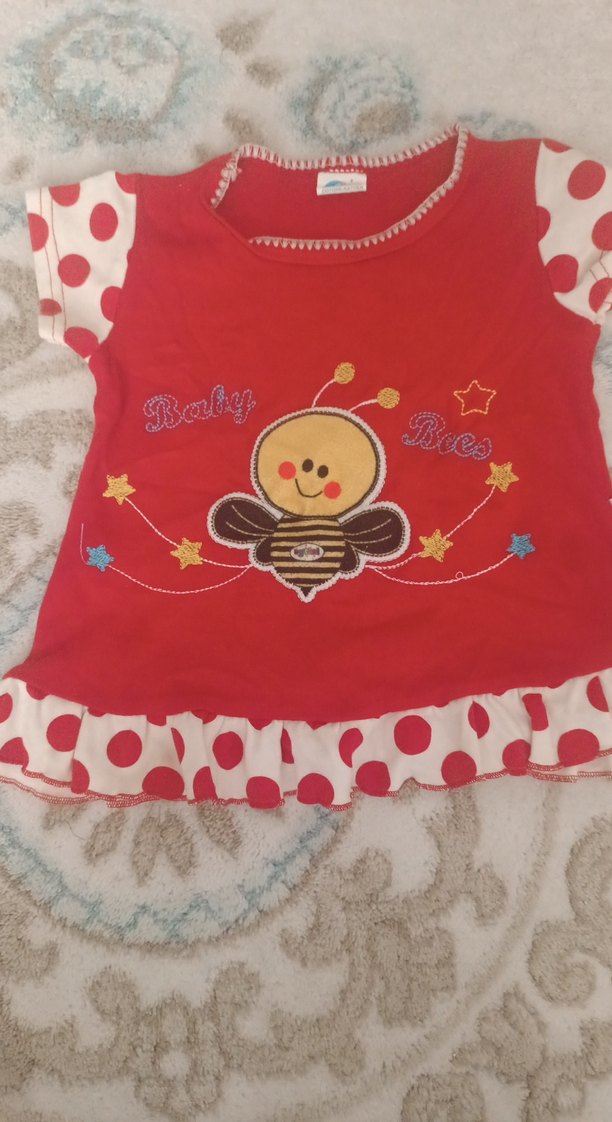 Kısa kollu, yuvarlak yakalı kız çocuk tişörtü. Üzerinde renkli arı baskısı ve "Baby Rios" yazısı bulunur. Puantiyeli fırfır detayları vardır. Yumuşak sentetik kumaştan yapılmıştır.