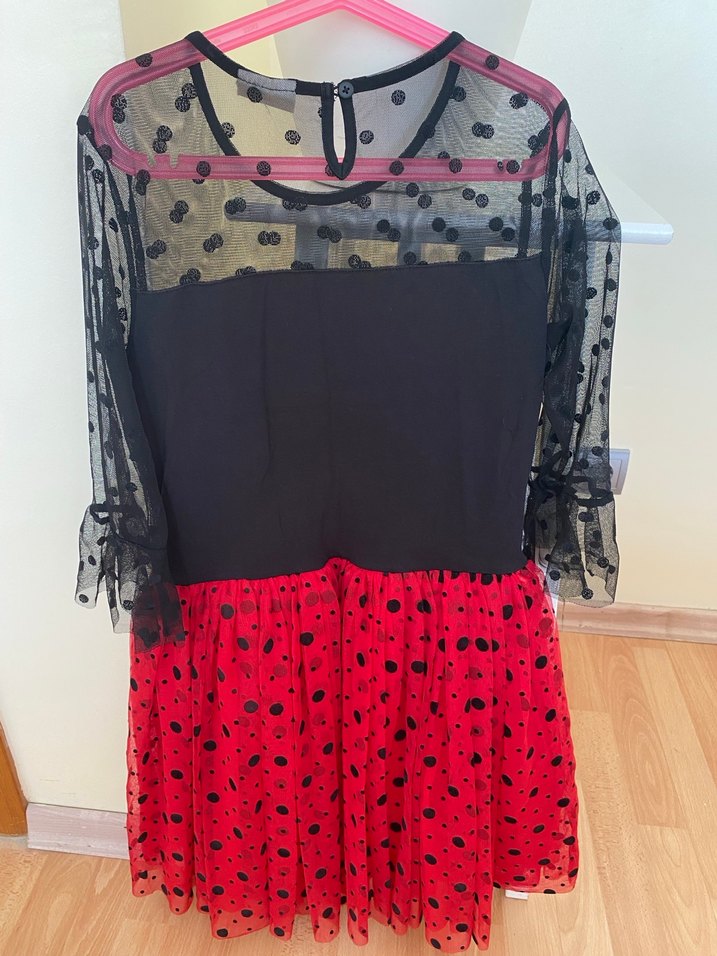 Kız çocukları için koyu kırmızı puantiyeli, bol kesim ve fırfır detaylı gotik elbise. Askılı, straplez yakalı ve siyah tüllü üst kısmı ile şık. Sentetik kumaş.Okulda gösteri için alındı ve sadece 1 kez giyildi.