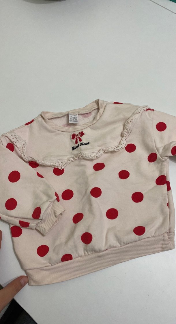 Kız çocuk sweatshirt, yuvarlak yaka ve uzun kolludur. Beyaz zemin üzerinde kırmızı puantiyeler ve göğüste fırfır detayı vardır. Yumuşak ve sıcak kumaştan üretilmiştir. Sayılı kullanıldı temiz defosuz