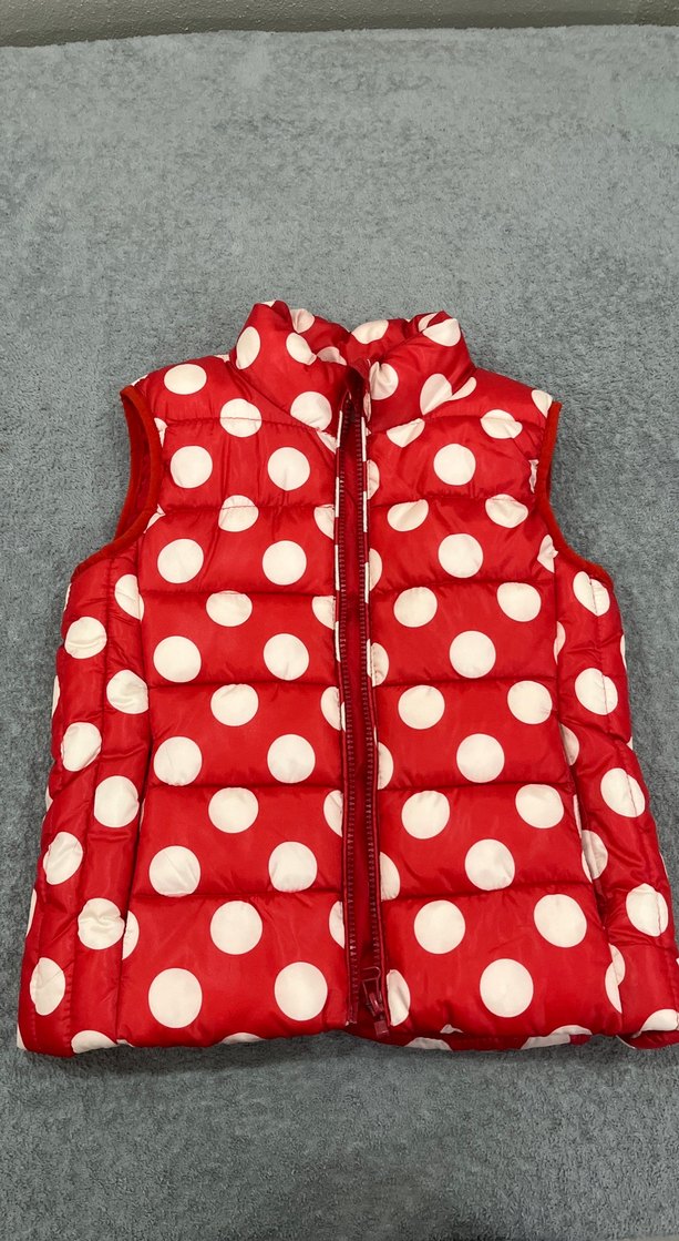 Kız çocukları için dar kesim, yüksek yakalı kırmızı puantiyeli yelek. Düğmeli ve kolsuz, yumuşak ve sıcak kumaştan üretilmiştir.