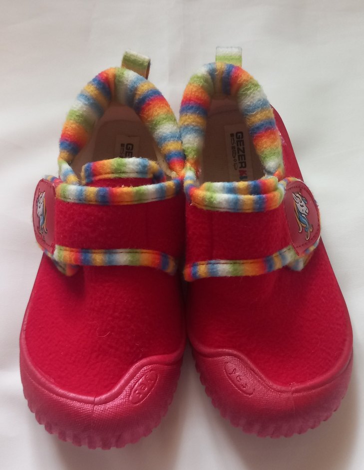 Kız çocukları için renkli ev terliği, yumuşak kırmızı dış yüzey ve renkli tie-dye desenli fleece astar içerir.