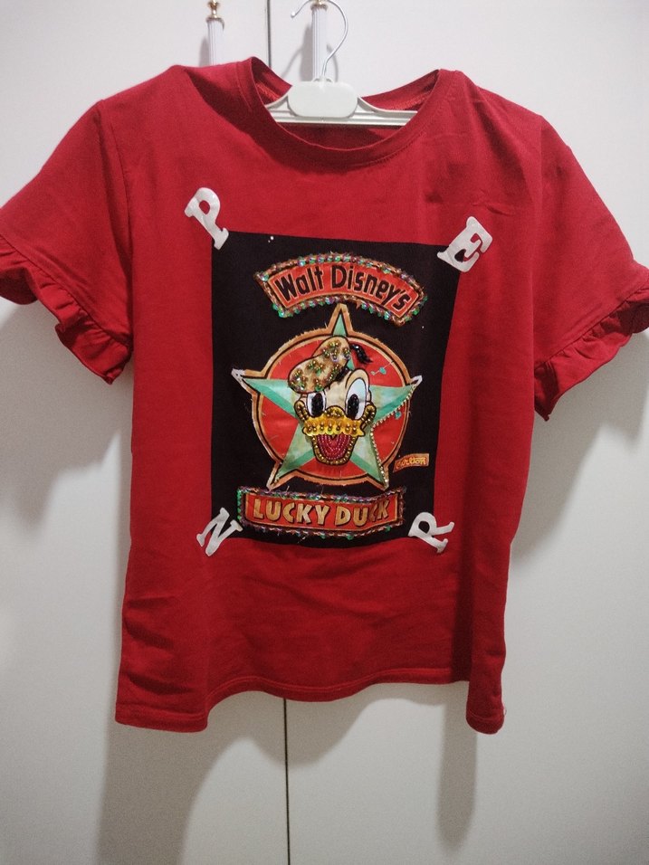 Kız çocukları için pamuklu, kırmızı renkli, bol kesim kısa kollu tişört. Kol uçlarında fırfır detayı ve renkli baskı bulunur. Rock punk tarzında, yuvarlak yaka. M beden küçük bir delik var son resimde belirttim