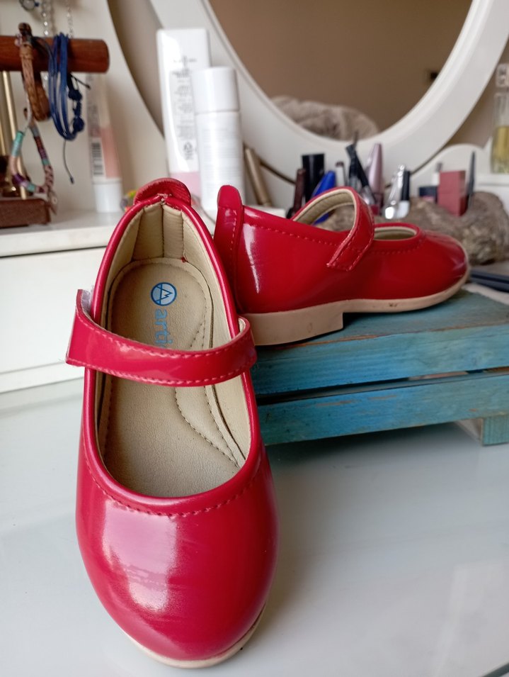 Kız çocukları için parlak kırmızı rugan babet ayakkabılar. Tokalı bant ve rahat kauçuk tabana sahip modern klasik tarz.
