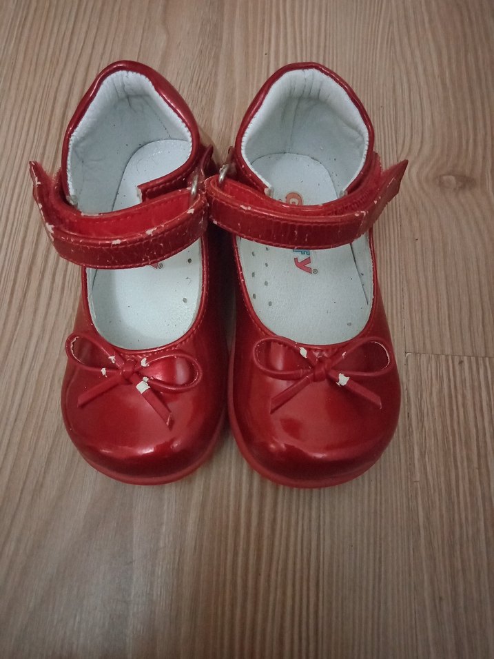Kız çocukları için parlak kırmızı rugan görünümlü kauçuk babet ayakkabılar, tokalı bant ve önünde küçük fiyonk detayıyla sade ve klasik tasarıma sahiptir.