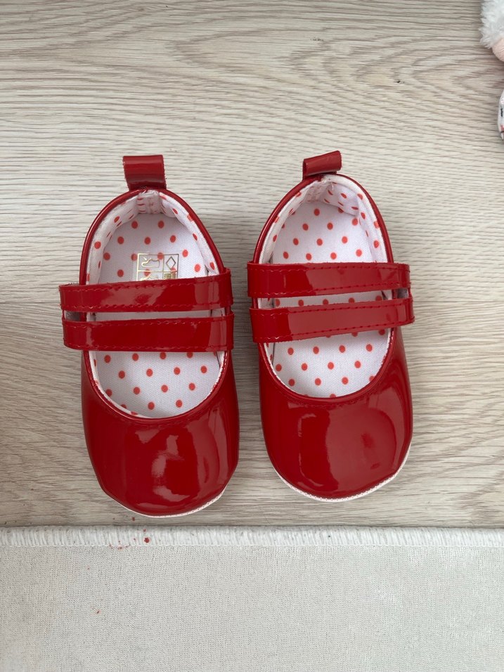 Kız çocukları için parlak kırmızı rugan babet ayakkabılar, iç kısmı renkli puantiyeli desenlidir. Düz ve çağdaş tasarıma sahiptir.