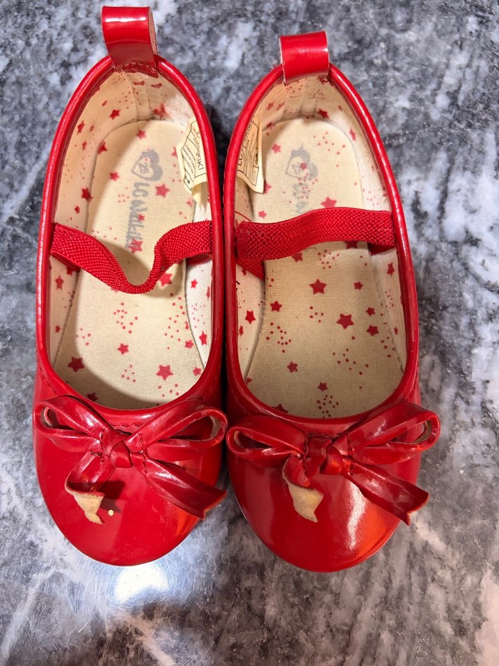 Kız çocukları için kırmızı, rugan görünümlü, tokalı bantlı babet ayakkabılar. Renkli ve sade tasarıma sahip, iç tabanda yıldız desenleri bulunur. LCW kırmızı ayakkabı