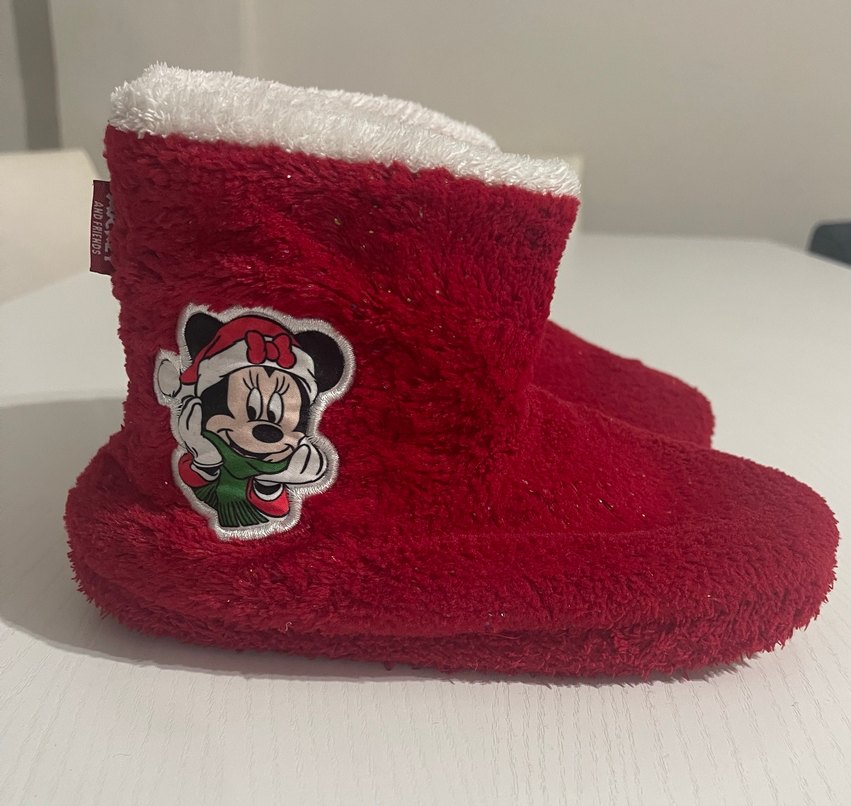 Kız çocukları için yumuşak ve sıcak kumaş, kürk detaylı, renkli nakışlı pop kültür desenli kırmızı ev terliği.