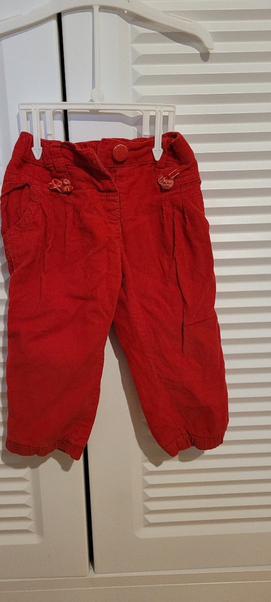 Kırmızı süet kız çocuk pantolon, bol kesim ve düğmeli tasarıma sahip. Sokak modasına uygun rahat bir görünüme sahiptir.