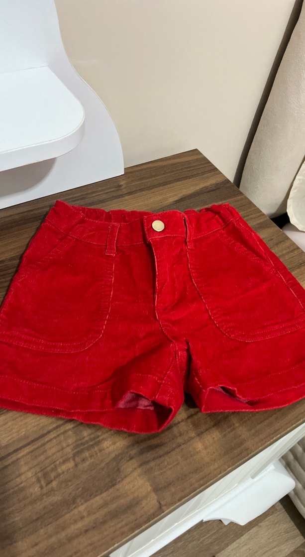 Koyu kırmızı renkte, süet kumaştan yapılmış, düğmeli ve bol kesim kız çocuk şortu. Sokak stiline uygun sade ve temel tasarım. ✨