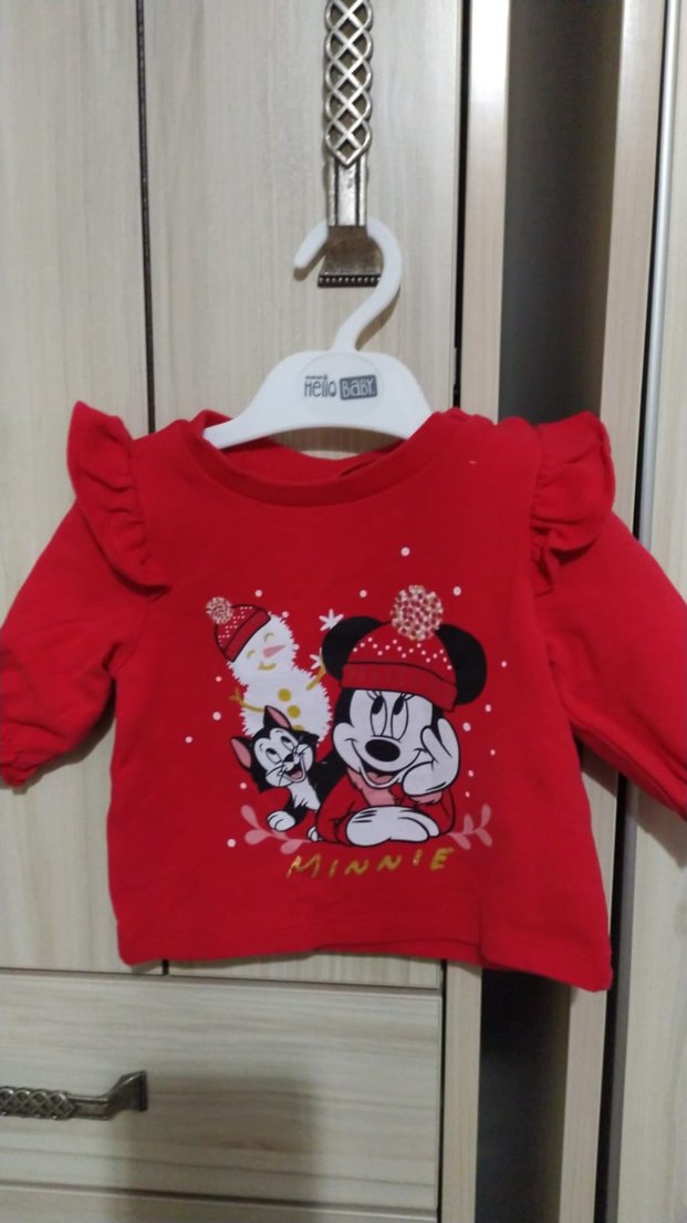 1-3 ay kırmızı sweatshirt ve 2li tayt. Yumuşak, sıcak dokulu kumaştan üretilmiştir. Baskılı ve parlak renklidir. 56/62 cm, 1-3 ay.
