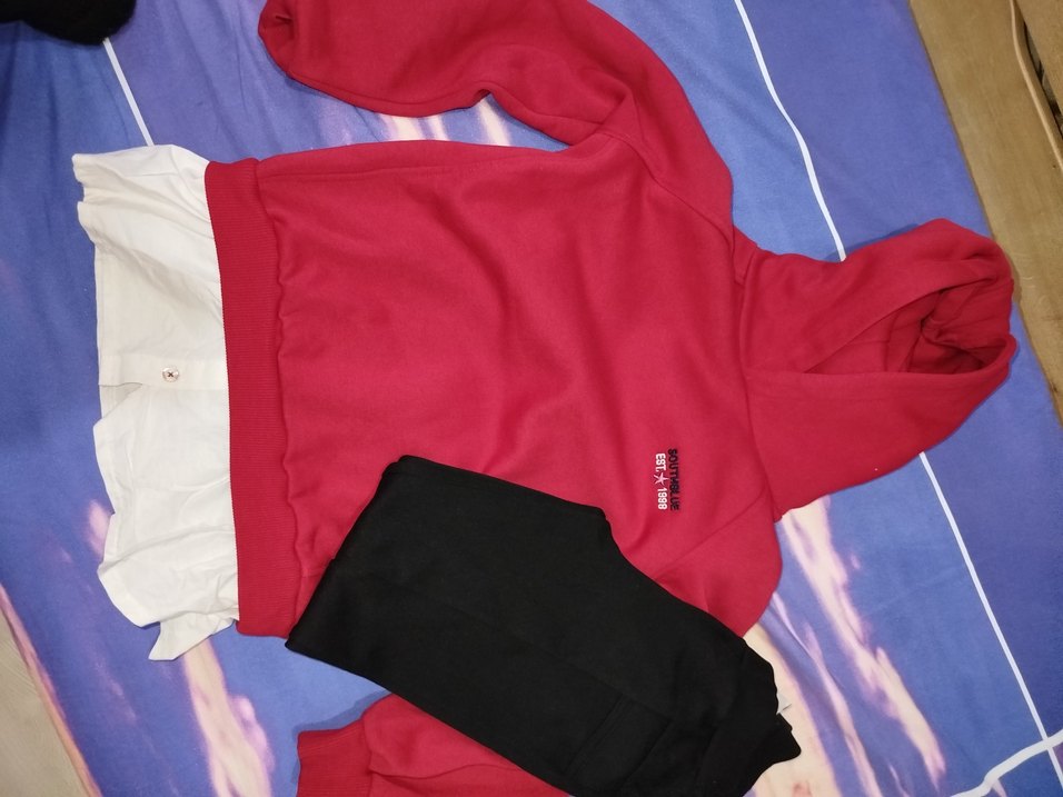 Koyu kırmızı, uzun kollu, bisiklet yaka kız sweatshirtü ve siyah eşofmandan oluşan, rahat ve şık bir sokak stili seti. kız çocuk kıyafetleri hepsi bu fiyatadir 8 ve 9 yaş ürünler