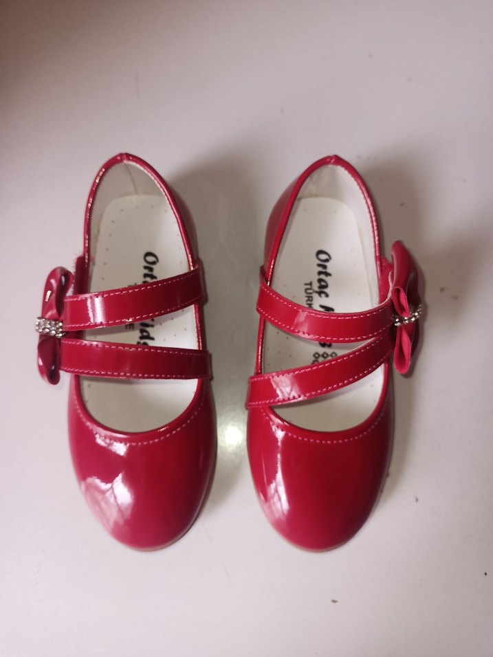Kız çocuklar için kırmızı, tokalı babetler. Düz ve renkli tasarıma sahip, iç kısmında "Ortap" yazısı bulunur.