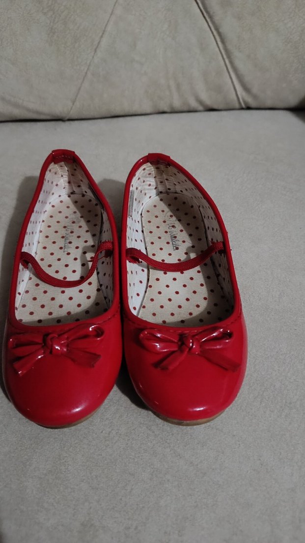 Kız çocukları için kırmızı tokalı ve fiyonk detaylı, lastik malzemeden yapılmış babet ayakkabı. İç kısmı puantiyeli kumaşla kaplıdır.