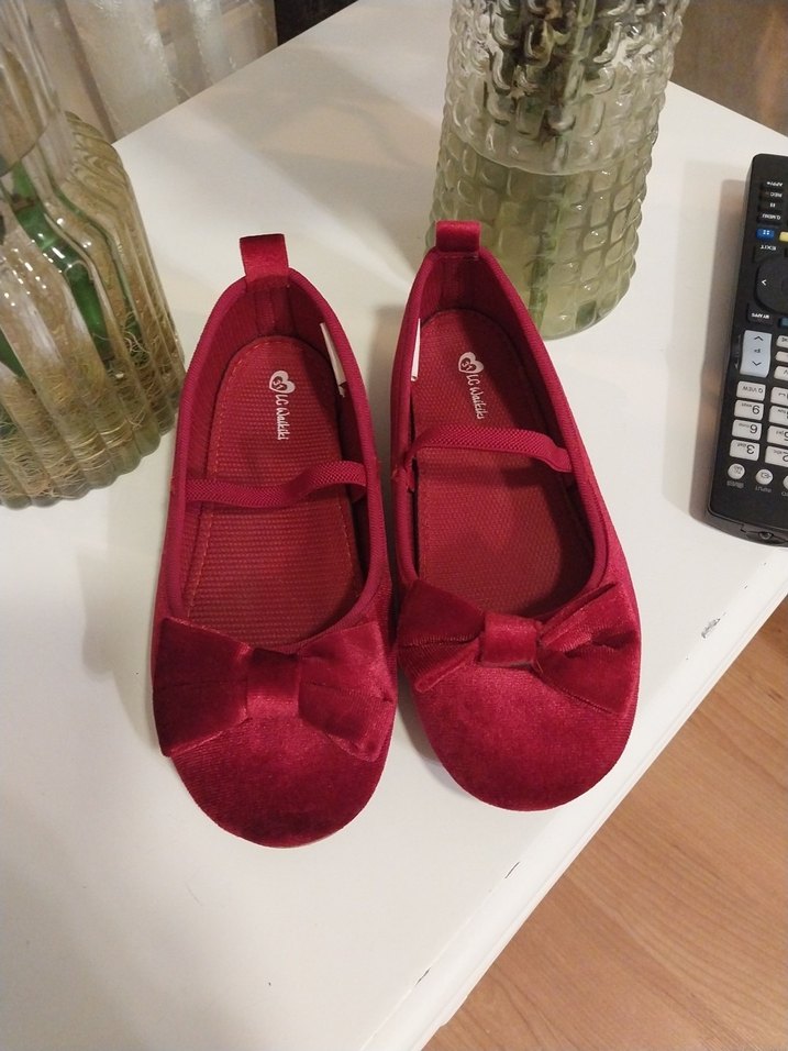 Kız çocukları için kırmızı tokalı babetler, kauçuk malzemeden üretilmiştir. Düz ve desensiz tasarıma sahip, sade fiyonk detayı içerir.
