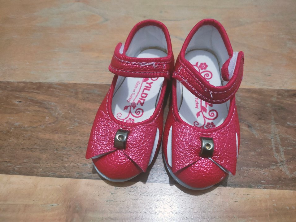 Kız çocukları için tokalı, baskılı iç dizayna sahip kırmızı klasik babet ayakkabı. Dayanıklı kauçuk malzemeden üretilmiştir.