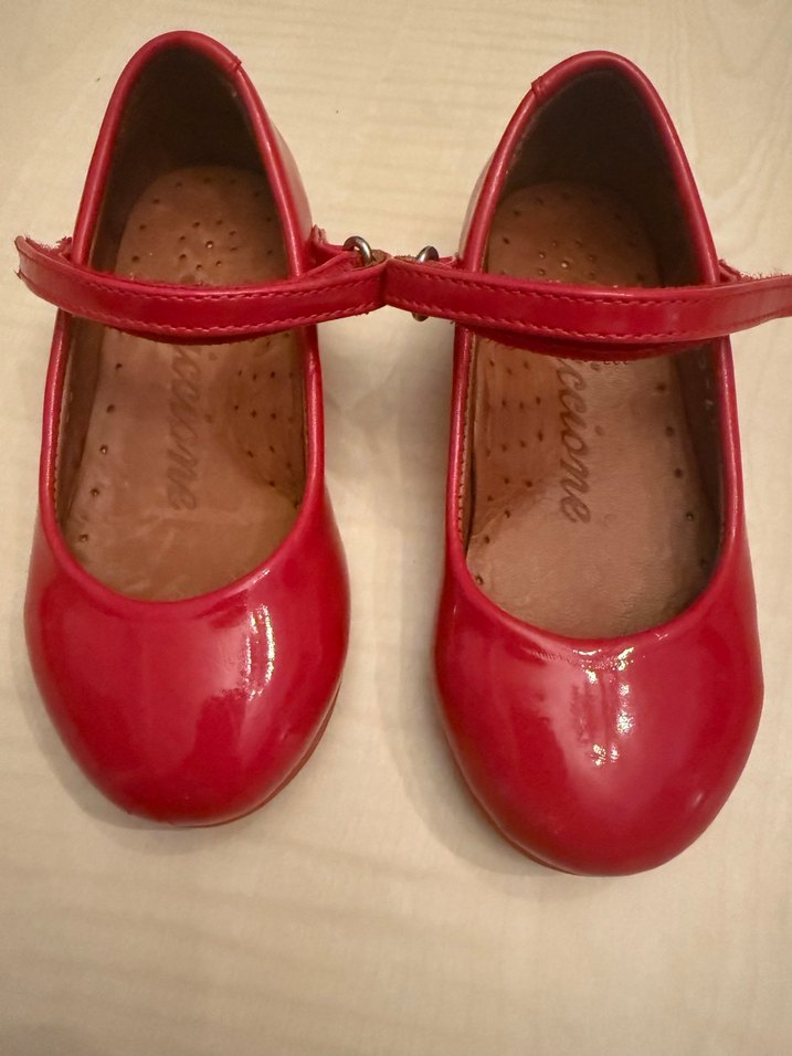 Kız çocukları için kırmızı, tokalı bantlı ve düz kauçuk malzemeden yapılmış klasik ve sade tasarımlı babet ayakkabı.