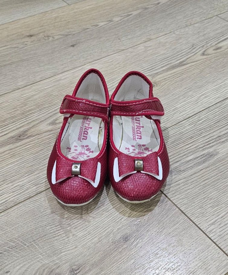 Kız çocukları için kırmızı renkli, tokalı ve fiyonk detaylı yılan derisi desenli babet ayakkabılar.Ayakkabi sadece bir kez giyilmistir.temiz.
