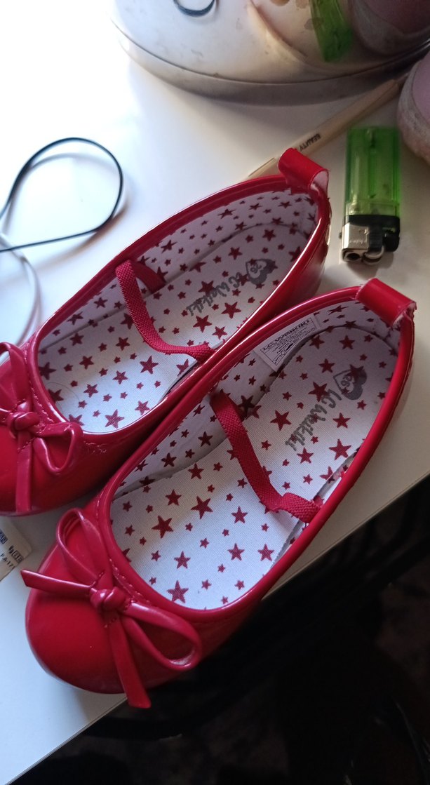 Kız çocuklar için kırmızı tokalı, lastik malzemeden yapılmış babet ayakkabı. Fiyonklu ve yıldız desenli iç astarlı, renkli ve rahat tasarım.