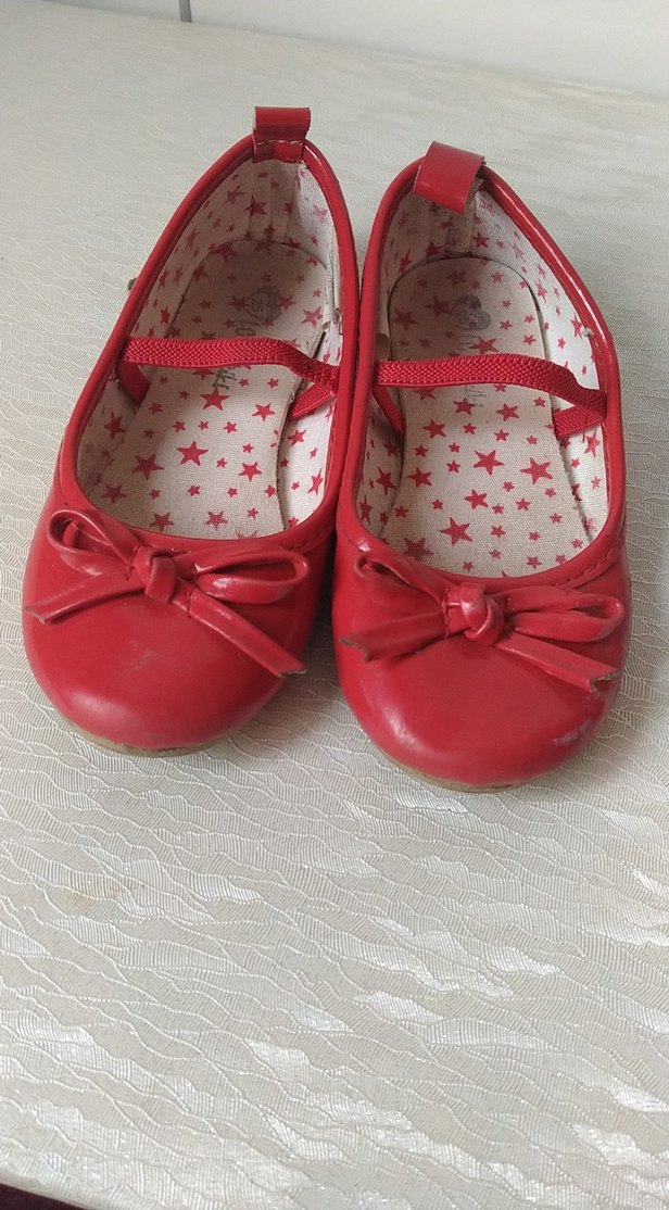 Kız çocukları için kırmızı renkli, tokalı kayışa sahip, kauçuk malzemeden yapılmış, yıldız desenli iç tabanlı sade babet ayakkabı.