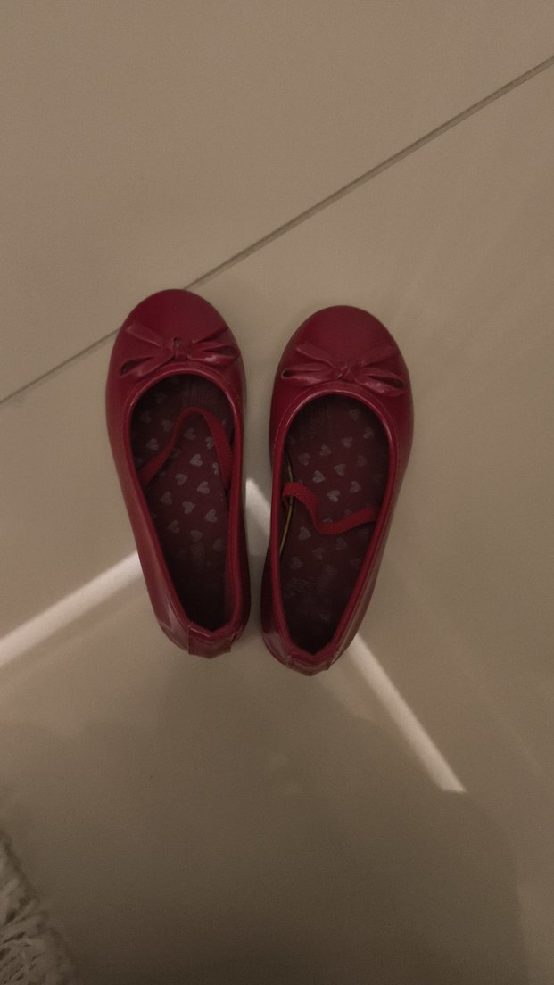 Kız çocukları için kırmızı, tokalı ve kauçuk malzemeden yapılmış babet ayakkabı. Sade ve renkli tarzda.