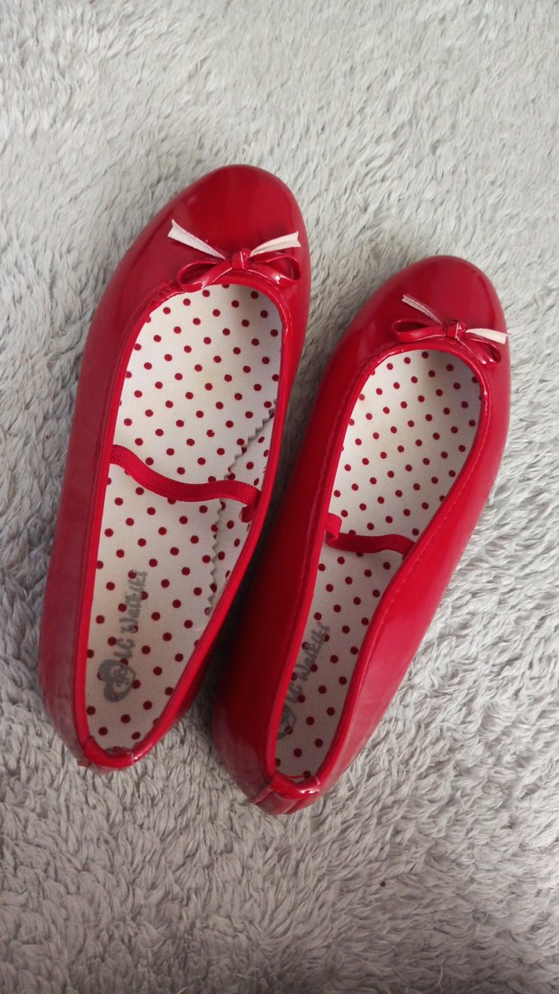 Kız çocuklar için kırmızı renkli, tokalı ve noktalı iç tabanlı kauçuk babet ayakkabı.