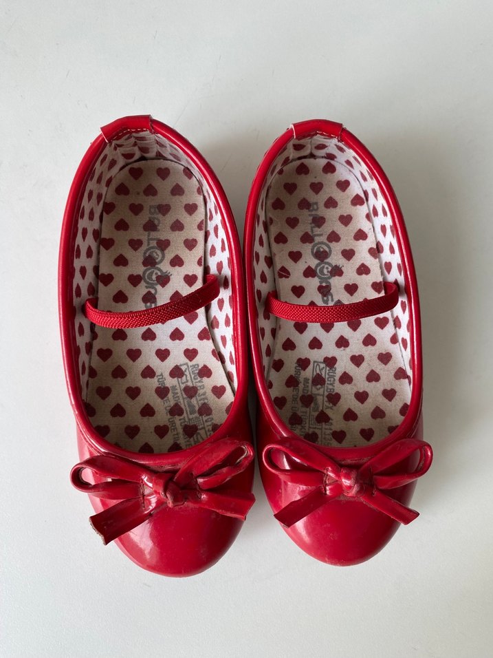 Kız çocukları için kırmızı renkte, tokalı bantlı, sade ve renkli tasarımlı kauçuk babet ayakkabı. İç kısmı kalp desenlidir.