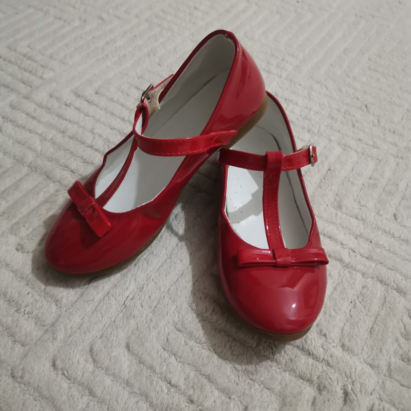 Kız çocukları için tokalı, kırmızı parlak yüzeyli ve esnek kauçuk malzemeden yapılmış klasik tarzda babet.