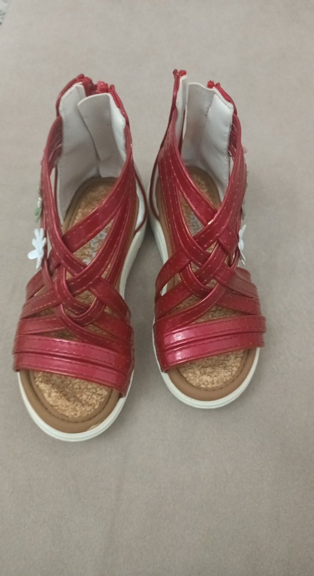 Kırmızı tokalı, renkli çiçek desenli ve rahat kauçuk tabanlı kız çocuk sandaletleri.