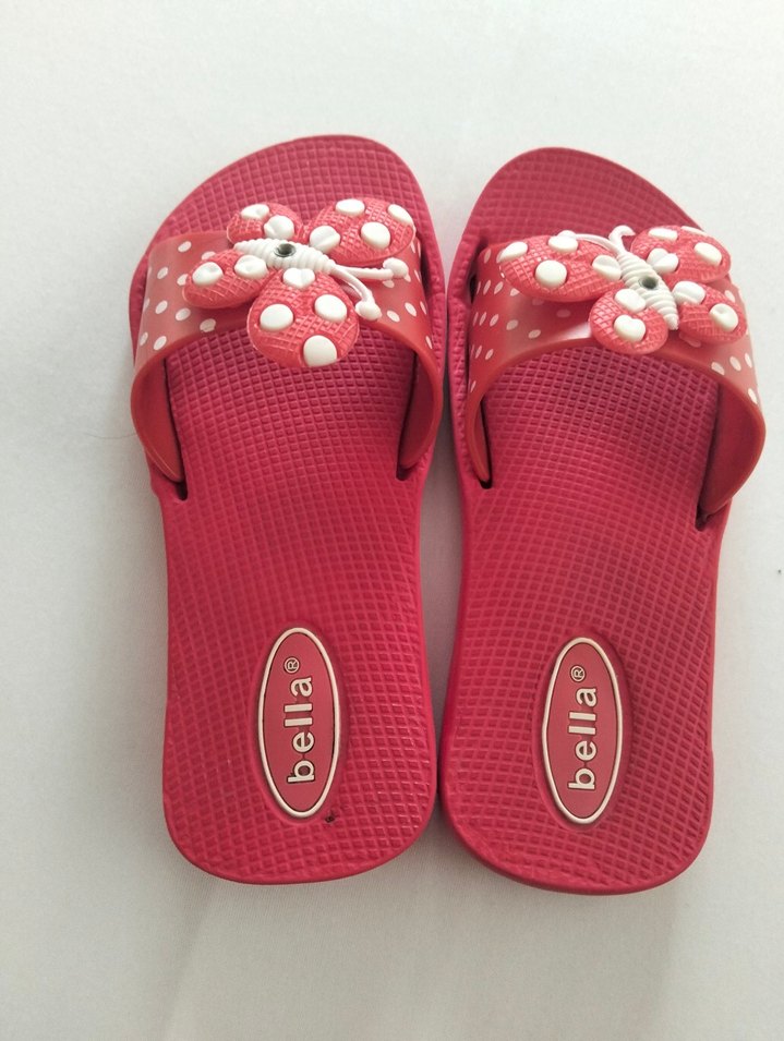 Kız çocukları için kırmızı renkte, tokalı, düz tasarımlı kauçuk terlikler. Rahat ve renkli bir model.