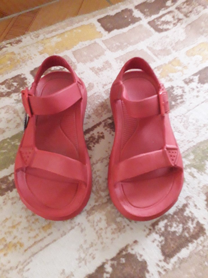 Kız çocukları için pastel kırmızı renkte, tokalı ve yumuşak kauçuk malzemeden yapılmış terlikler. Düz ve bohem tarzda, desen içermeyen model.