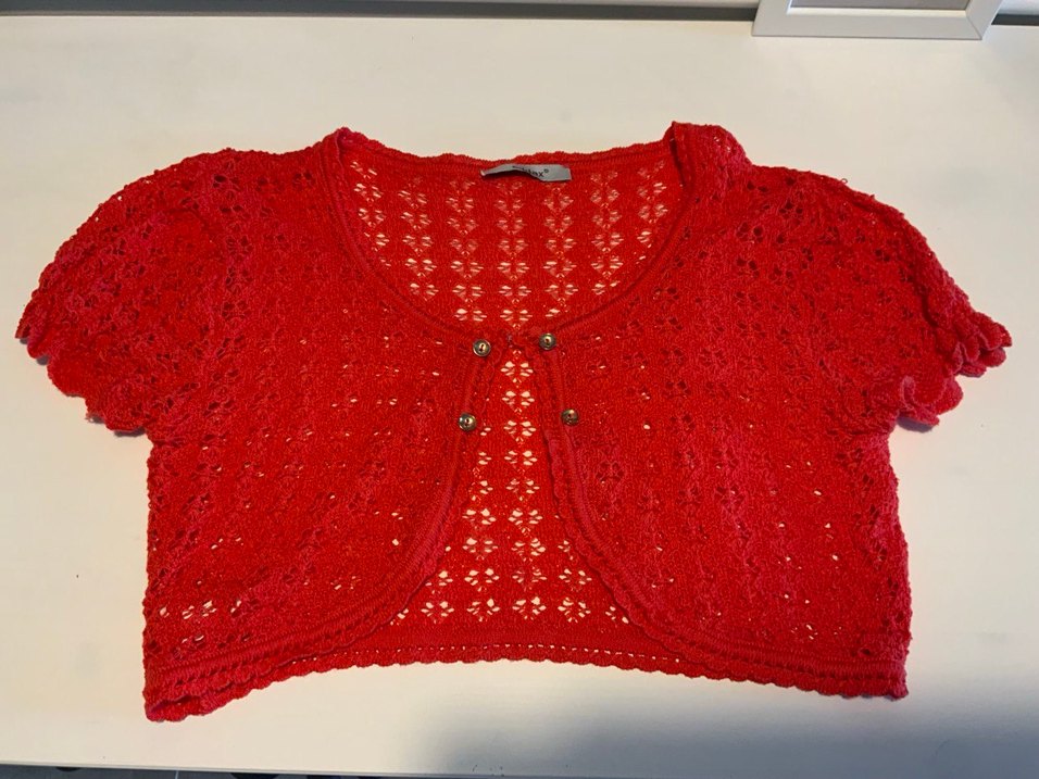 Kız çocuk için kırmızı renkli, triko dokulu, uzun kollu ve yuvarlak yakalı bolero. Bohem tarzda, oturan kesim ve süslü düğmeler içerir.